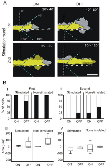 During the first irradiation, 100% of the cells increased their growth cone area on the stimulated quadrant (0–90°) versus 50% on the adjacent, non-stimulated quadrant (90–180°), as illustrated by the bars labeled ON in Figure 1C-I. The median values of the growth cone area difference between the end and the beginning of the stimulation were 27.68 and 0.312 µm2 on the stimulated and non-stimulated quadrants, respectively (Figure 1C-III, stimulated-ON, non-stimulated-ON), although no significant difference in the statistical sense was obtained (Kruskal–Wallis test, p > 0.05). When the laser was turned off, 75% of the cells increased their growth cone areas in the stimulated quadrant. The median values of the growth cone area difference in the stimulated quadrant between the end and the beginning of the 20 min periods of ON and OFF were 27.68 and 26.98 µm2, respectively (Figure 1C-III, stimulated ON and OFF), although the values were more largely dispersed when the laser was OFF.