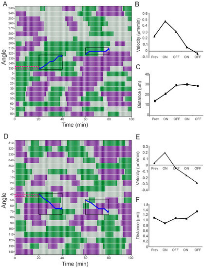 The laser provoked an increase in the mean velocity of cell projection at the irradiated angles, depending on the cell status previous to the irradiation. Cells that had a green region before the irradiation angles (Figure 3A,D, red squares) increased their mean velocity of projection in the first ON period (Figure 3B,E), while cells that had a gray region or just began to advance previous to the laser irradiation (Figure 4A,D, red squares) did not increase and even decreased their mean velocity of projection once the laser was on.