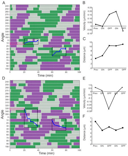 Quantification of PC12 growth cone velocity of projection. Multivariate time series plot of discretized velocities of projection at different angles. (A–C, cell #1) and (D–F, cell #2). Green, purple, and gray correspond to positive, negative, and null velocities, respectively. Black squares indicate the angles where the laser was located and blue arrows the displacement of the spot. In both cells, positive velocities were registered for at least 10 min previous to the first round of irradiation, at the angles of the spot location (red dotted squares). (B,E) show the median values of the velocities of projection, and (C,F) the median values of the cumulative distance, in both cases at the angles where the spots were located during the irradiated (ON), non-irradiated (OFF), or previous to irradiation (PREV) periods.