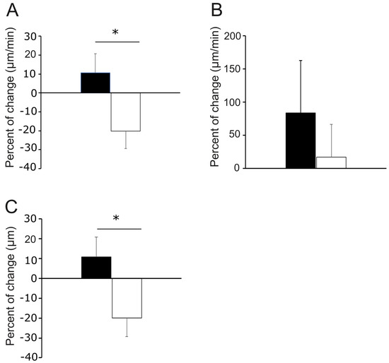 Percentage of change in membrane projection of PC12 active or static cells under laser irradiation. The percentage of change of (A) average speed, (B) average velocity, and (C) average distance was obtained from the irradiated regions of cell membranes before and after laser stimulation. Black columns correspond to cells that were projecting for at least five minutes before the beginning of laser irradiation (active); white columns correspond to cells that were immobile or retracting at the beginning of the laser irradiation (static). Bars represent the standard error. Asterisk (*) indicates statistically significant difference between the two conditions (Student’s t test p < 0.05). n = 8 cells per condition.