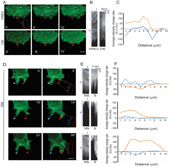 The cytoskeleton has been scarcely studied in cells stimulated to project by a NIR laser. We used 3T3 cells to study the actin dynamics due to the larger size of their lamellipodia and filopodia. By comparing changes in the average fluorescence signal in a rectangular area of 10 × 2 µm2 of a cell protrusion, before and during laser stimulation (Figure 6A,B, PREV and ON), we observed a faster rate of change of the actin-GFP signal during 12 min of laser stimulation than the same period of time and area before NIR stimulation (Figure 6C). In both cases, the rate of intensity change decreases at the cell leading edge. At the NIR laser stimulated protrusion, a filament-shaped actin accumulation that grows towards the cell leading edge and perpendicular to the stress fibers is observed; in the same area, before laser stimulation, we observed actin-GFP signal fluctuation among diffuse staining and thin actin filaments (Figure 6A).