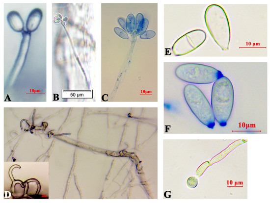 Morphology of Arthrobotrys robusta on LCMA. (A–C) Mycelium and conidiophores; (D) Bundled PWNs and three-dimensional fungal cords; (E,F) Conidia; and (G) Chlamydospores.