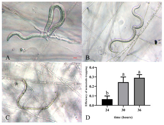 Trapping process of PWNs exposed to A. robusta. (A) The formation of the trap when PWNs were exposed to A. robusta for 24 h. (B) The trap’s contraction when PWNs were exposed to A. robusta for 30 h. (C) The increase in the size of the trap when PWNs were exposed to A. robusta for 36 h. Bar = 10 μm. (D) Nematode-trapping efficiency of PWNs exposed to A. robusta.