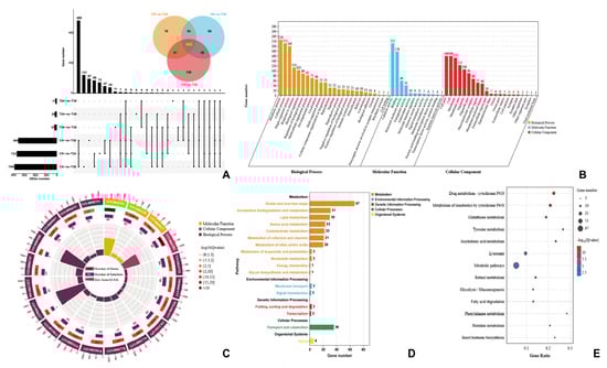 DEGs of PWNs when exposed to Arthrobotrys robusta. The upset plot and Venn diagram show the number of DEGs in each group (A). Set Size represents the number of DEGs. GO classification (B) and enrichment analysis (C) of DEGs (p ≤ 0.05). The first circle: different colors represent different ontologies; the second circle: the number of genes in the GO term; the third circle: purple represents the proportion of DEGs; and the fourth circle: the number of differential genes in the GO term divided by the number of background genes in the GO term. KEGG pathway classification (D) and enrichment analysis (E) of the DEGs.