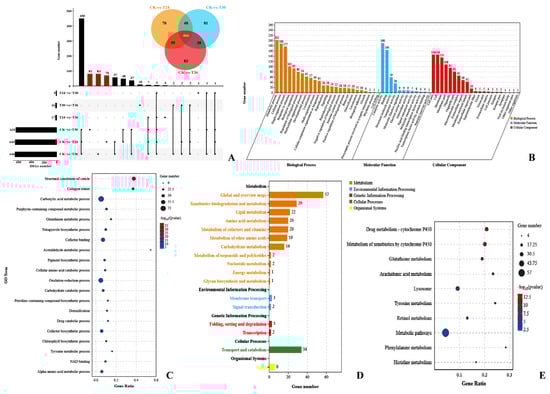 A total of 466 shared, upregulated DEGs between the three different time points with the control samples were analyzed (Figure 4A). These upregulated DEGs were categorized into 58 GO terms (25 biological processes, 12 molecular functions, and 21 cellular components) by GO classification. Among them, the top three GO classifications were metabolic process (202 DEGs, GO:0008152), catalytic activity (190 DEGs, GO:0003824), and cellular process (188 DEGs, GO:0009987) (Figure 4B). A total of 256 DEGs were categorized into 546 GO terms by GO enrichment analysis (p < 0.05). Carboxylic acid metabolic process (72 DEGs, GO:0019752) and oxidation-reduction process (60 DEGs, GO:0055114) were prominent GO terms according to GO enrichment analysis (Figure 4C). Furthermore, 101 DEGs were categorized into 10 KEGG pathways (p < 0.05, q < 0.05). Among them, nine glutathione S-transferases genes (GST) and two hematopoietic prostaglandin D synthase genes (HPGDS) were significantly changed, which contributed to drug metabolism by cytochrome P450 (24 DEGs, ko00982), metabolism of xenobiotics by cytochrome P450 (24 DEGs, ko00980), and glutathione metabolism (17 DEGs, ko00480) determined by KEGG enrichment analysis (Figure 4D,E).