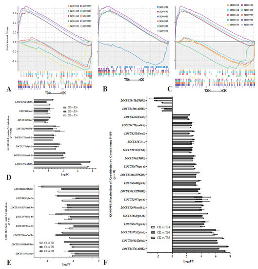 Gene set enrichment analysis (GSEA) of DEGs by KEGG. (A) GSEA of CK vs. T24 by KEGG; (B) GSEA of CK vs. T30 by KEGG; and (C) GSEA of CK vs. T36 by KEGG. NOM p < 0.05; FDR q < 0.05. (D) KO00350 pathway gene expression levels in RNA-seq; (E) KO01212 pathway gene expression levels in RNA-seq; and (F) KO00980 pathway gene expression levels in RNA-seq.