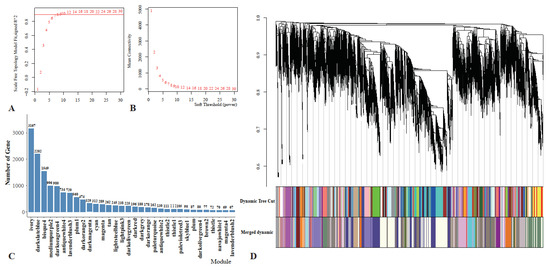 Co-expression network analysis diagram. (A) The scale-free fit index versus soft-thresholding power; (B) changes in average gene connectivity at different powers; (C) the number of genes in each module; and (D) clustering dendrograms of genes and different colors represent different modules.
