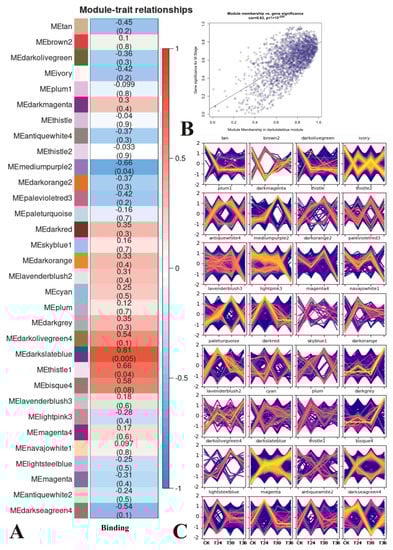 Correlation diagrams of RNA-seq. (A) Module trait relation. (B) Scatterplot of MM and GS correlations for the most positively correlated module. The dots indicate genes, and the diagonal lines indicate the fitted lines of correlation. (C) Genes expression pattern in each module. The yellow lines represent patterns of gene expression that match the pattern most closely, whereas red denotes similar patterns, and blue denotes less similar patterns.