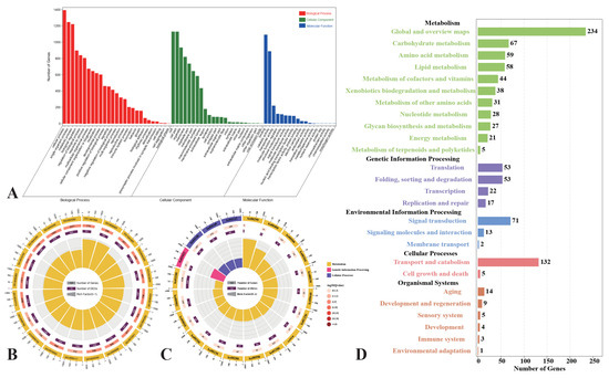 Genes expression patterns of darkslateblue. (A) Go classification; (B) GO enrichment analysis (p ≤ 0.05). The first circle: different colors represent different ontologies; the second circle: the number of genes in the GO term; the third circle: orange represents the proportion of up-regulated genes, while purple represents the proportion of down-regulated genes; and the fourth circle: the number of differential genes in the GO term divided by the number of background genes in the GO term. (C) KEGG enrichment analysis (p ≤ 0.05). The first circle: different colors represent different ontologies; the second circle: the number of genes in the KEGG pathway; the third circle: orange represents the proportion of up-regulated genes, while purple represents the proportion of down-regulated genes; and the fourth circle: the number of differential genes in the KEGG pathway divided by the number of background genes in the KEGG pathway. (D) KEGG pathway classification.