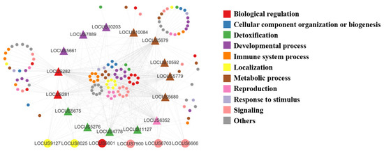 These genes were flavin-containing monooxygenases genes (FMO), glutathione S-transferase genes (GST), uridine diphosphate glycosyltransferase genes (UGT), alcohol dehydrogenase genes (ALDH), epoxide hydrolase genes (BXYJ_LOCUS5661), hydroxyphenylpyruvate dioxygenase genes (BXYJ_LOCUS5779), carbonyl reductase genes (BXYJ_LOCUS6352), and thrombin AT genes (BXYJ_LOCUS7889) from 15 metabolism-related genes in the darkslateblue module according to the results from Cytoscape3.9.1. These 15 hub genes were associated with 69 genes from 148 pairs of relationships. Meanwhile, the results of the network showed that the genes of localization, biological regulation, and signaling had the most complex interrelationship with other categories (Figure 9, Table S4).