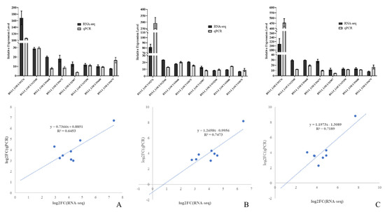 The RNA was reverse-transcribed by Prime Script™ IV 1st strand cDNA Synthesis Mix (Takara Biomedical Technology, Beijing, China). The genes related to growth and development, xenobiotic metabolism, and pathogenicity were subjected to quantitative, real-time polymerase chain reaction (qRT-PCR) using 2 × SYBR Green qPCR Master Mix (Bimake, Shanghai, China) [41] (Table S1). Three technical replicates and three biological replicates were tested for each sample and analyzed using the 2−ΔΔCt method [42]. To compare the RNA-Seq and qPCR results, a linear correlation was calculated using Log2FC.