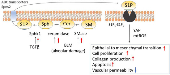 When human fibroblasts were stimulated with TGFβ or bleomycin, the levels of mitochondrial reactive oxygen species (mtROS) and transcription factors, such as Hippo/yes-associated protein (YAP), fibronectin (FN), and αSMA, were elevated. Inhibition of Sphk1 or YAP resulted in a decrease of mtROS and less expression of FN and αSMA. Furthermore, inhibition of each of S1P and YAP resulted in a similar decrease of mtROS and less expression of FN and αSMA [99]. On the basis of these findings, S1P is considered to possibly induce mitochondrial damage and YAP-mediated fibrosis.