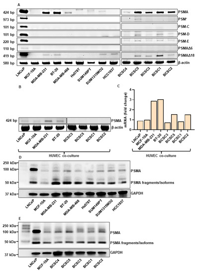 Expression of PSMA isoforms in TNBC. (A) RT-PCR analysis of PSMA and isoforms (PSMA, PSM’, PSM-C, PSM-D, PSM-E, PSMAΔ6, and PSMAΔ18) in the indicated TNBC cell lines and BCSCs. β-actin represents the loading control. (B) RT-PCR analysis of PSMA in HUVECs co-cultured for 96 h in a trans-well system with the indicated cell lines. (C) qPCR analysis of PSMA in HUVECs co-cultured for 96 h in a trans-well system with the indicated cell lines. (D,E) SDS/Western Blot analysis of PSMA in TNBC (D) and BCSC (E) cell lines. Total cell lysates were used. GAPDH represents the loading control.