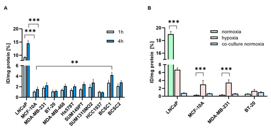 Hypoxia significantly increased binding and uptake of [177Lu]Lu-PSMA in MCF-10A (0.3% vs. 3%) and MDA-MB-231 (0.4% vs. 3.4%), whereas the PCa cells LNCaP showed decreased uptake under hypoxia (19% vs. 6.7%) (Figure 5B). In the co-culture experiments, HUVECs co-cultured with BT-20 showed the highest [177Lu]Lu-PSMA uptake (1%). The PSMA uptake of the HUVECs co-cultured with MDA-MB-231 and BT-20 (0.6% and 1%) was higher than the uptake of MDA-MB-231 and BT-20 cells alone (0.3% and 0.6%).