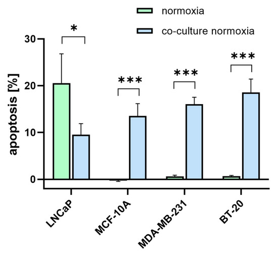 The treated TNBC cell lines MDA-MB-231 and BT-20 showed a higher apoptotic rate than MCF-10A. [177Lu]Lu-PSMA had no effect on the MCF-10A control. In the HUVEC, the highest apoptosis was detected in co-cultures with TNBC cell lines.