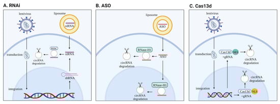 - Zhang, Y.; Nguyen, T.M.; Zhang, X.O.; Phan, T.; Clohessy, J.G.; Pandolfi, P.P. Optimized RNA-Targeting CRISPR/Cas13d Technology Outperforms ShRNA in Identifying Essential CircRNAs. Genome Biol. 2021, 22, 41. [Google Scholar] [CrossRef]