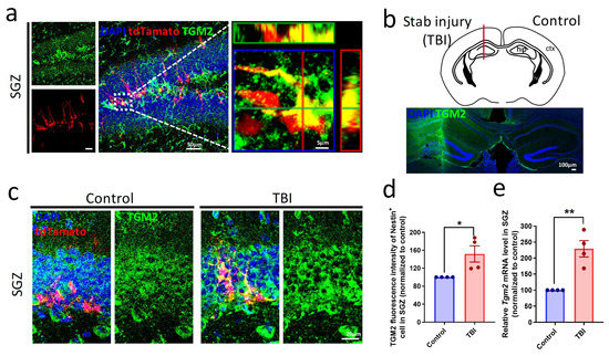 To examine whether Tgm2 is expressed in hippocampal NSPCs, we performed immunofluorescent staining of TGM2 in hippocampal tissues of 1-month-old Nestin-creERT2;tdTamato mice which had tamoxifen-induced tdTamato labeling of nestin-expressing stem cells and their progeny in neurogenic regions. We found that TGM2 was highly expressed in NSPCs (tdTamato+) in the subgranular zone (SGZ) of the hippocampus (Figure 1a). Using a mouse model of hippocampal stab wound injury (Figure 1b), we observed that both Tgm2 mRNA and protein expression levels were significantly elevated in SGZ at 7 days after injury (Figure 1c–e), suggesting that TGM2 might play a pivotal role in neurogenesis following TBI.