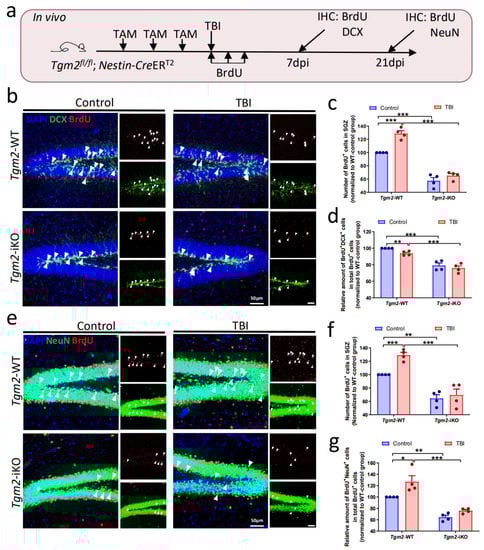 Next, we applied a unilateral hippocampal stab wound injury to 6–8 weeks-old Tgm2 WT and iKO mice to examine whether TGM2 depletion affects proliferation and differentiation of NSPCs after TBI. Following intraperitoneal administration of TAM for three consecutive days, animals were subjected to TBI and administered BrdU (200 mg/kg body weight) daily for three consecutive days (Figure 2a). At 7 days post-injury (dpi), TBI treatment increased the number of BrdU+ cells (F(1,12) = 26.91, p < 0.001), while TGM2-depletion significantly inhibited proliferation of NSPCs in the dentate gyrus (DG) (F(1,12) = 227.2, p < 0.001) (Figure 2b,c). Meanwhile, both TBI treatment (F(1,12) = 4.952, p < 0.05) and TGM2-depletion (F(1,12) = 85.59, p < 0.001) resulted in reduced percentages of DCX+BrdU+ cells in total BrdU+ cells in DG, indicating that knockout of Tgm2 represses neuronal differentiation of NSPCs following TBI (Figure 2d).