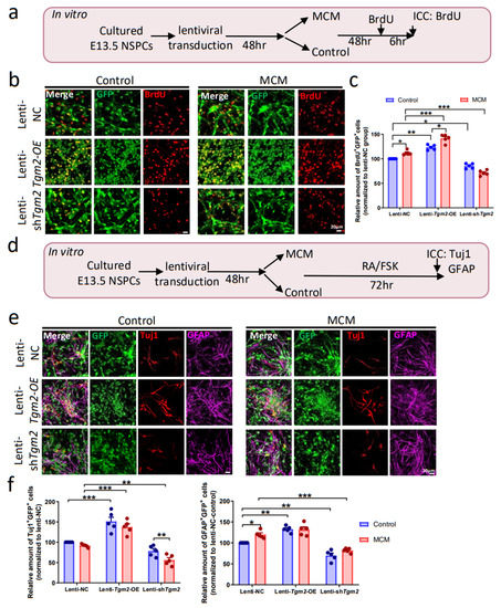 To analyze the role of TGM2 in NSPCs differentiation in vitro, the ratios of newborn neurons (GFP+Tuj1+) and new-formed astrocytes (GFP+GFAP+) to lentivirus-transduced NSPCs (GFP+) were quantified under pro-inflammatory conditions in vitro (Figure 3d). Our results showed that overexpression of TGM2 promoted the neuronal differentiation of NSPCs under both pro-inflammatory and normal conditions (Figure 3e,f). Knockdown of TGM2 significantly reduces the neuronal differentiation of NSPCs with MCM treatment.
