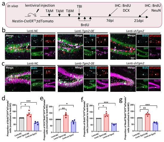 To examine whether TGM2 regulates adult neurogenesis in vivo, we grafted lenti-NC, lenti-Tgm2-OE, or lenti-shTgm2 into DG of 6–8 weeks old Nestin-CreERT2;tdTomato mice, which were then received intraperitoneal administration of TAM for three consecutive days. On the day after the last TAM injection, mice were received a stab wound injury in the hippocampus, as well as BrdU (200 mg/kg body weight) injection daily for three consecutive days (Figure 4a). At 7 days after the last BrdU injection, overexpression of TGM2 resulted in a significant increase in the proportion of BrdU+GFP+tdTomato+ cells among GFP+tdTomato+ cells as well as in the proportion of DCX+BrdU+GFP+tdTomato+ cells among BrdU+GFP+tdTomato+ cells, while knockdown of TGM2 significantly reduced the proliferation and neural differentiation of NSPCs compared to lenti-NC-transduced NSPCs (Figure 4b,d,e).