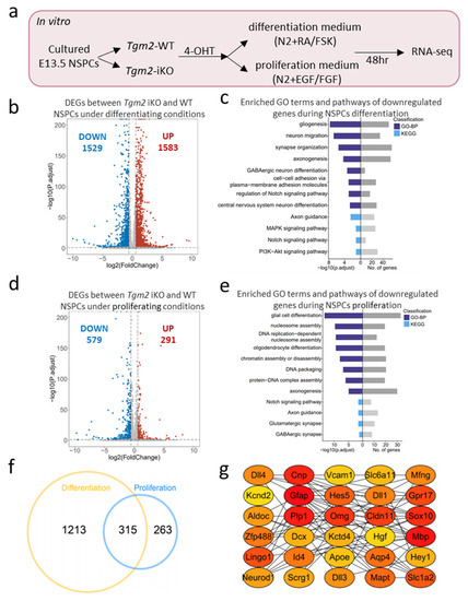Tgm2-deletion alters the expression of genes related to cell proliferation and neural differentiation. (a) Workflow diagram for transcriptome sequencing of Tgm2 iKO and WT NSPCs under proliferating or differentiating conditions. (b) Volcano plot illustrating the differentially expressed genes (DEGs) between Tgm2 iKO and WT NSPCs under differentiating conditions. Red, upregulated genes; Blue, downregulated genes. (c) Bar plot depicting the significantly enriched GO terms (biological processes, BP) and KEGG pathways of downregulated genes during neural differentiation of TGM2-null NSPCs. (d) Volcano plot illustrating the DEGs between Tgm2 iKO and WT NSPCs under proliferating conditions. Red, upregulated genes; blue, downregulated genes. (e) Bar plot depicting the significantly enriched GO terms (biological processes, BP) and KEGG pathways of downregulated genes during proliferation of TGM2-null NSPCs. (f) Venn plot illustrating the co-downregulated genes in processes of proliferation and differentiation. (g) Netplot depicting the linkages of TOP 30 co-downregulated genes as a network in processes of cell proliferation and neural differentiation.