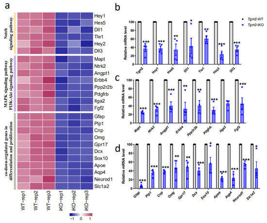 Deletion of Tgm2 dysregulates the expression of genes associated with the proliferation and differentiation of NSPCs. (a) Heat map diagrams of differentially expressed Notch and MAPK signaling-pathway genes between WT and Tgm2 iKO NSPCs in the differentiation process, as well as co-downregulated genes in processes of proliferation and differentiation of Tgm2 iKO NSPCs. (b–d) Quantitative PCR analysis validated the downregulation of genes associated with Notch signaling (b), MAPK and PI3-Akt signaling pathways (c) and co-downregulated genes in both proliferation and differentiation processes (d) using a new culture of Tgm2 iKO NSPCs under differentiating conditions. n = 4 cultures. Data are represented as means ± SEM; two-tailed t-test, * p < 0.05, ** p < 0.01, *** p < 0.001.