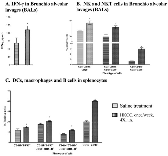 To investigate whether HKCC led to the modulation of local and systemic immune responses in Mtb infected mice corresponding to its protective efficacy, we first determined the level of IFN-γ in lung washes. Interestingly, intranasal treatment with HKCC led to significantly (* p ≤ 0.05) increased levels of effector cytokine IFN-γ Figure 5A). IFN-γ, an effector molecule known to be produced by adaptive immune effector (T) cells, is also produced in abundance by innate lymphocytes [49]. To determine the effect of HKCC in activating innate immune cells, we first examined the activation of infiltrated NK and NKT cells in BAL by determining CD25 and CD69 expression. Interestingly, coinciding with the presence of IFN-γ in the lung lavages, the percentage of activated NK and NKT cells was significantly higher in mice treated with HKCC by both routes compared to the saline treatment groups (Figure 5B).
