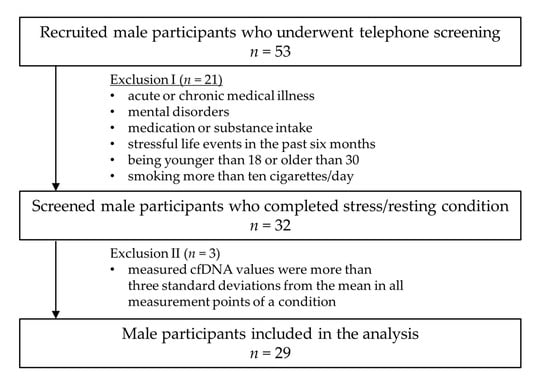 The healthy male controls (n = 29) were recruited through electronic tendering (e-tendering) and notice boards at the Johannes Gutenberg University Mainz. The exclusion criteria (acute or chronic medical illness, mental disorders, medication or substance intake, stressful life events in the previous six months, being younger than 18 or older than 30 years of age, and smoking more than ten cigarettes/day) were checked in a telephone interview based on the entire procedure of the Structured Clinical Interview (SCID; []) for the Diagnostic and Statistical Manual of Mental Disorders (DSM-IV, []). A sample inclusion/exclusion criteria flow chart is given in Figure 1. The mean age of the twenty-nine male participants was 24.34 (SD = 4.08) with a mean BMI of 22.94 kg/m2 (SD = 1.61). Three of the 29 included participants were smokers (under 10 cigarettes per day). With regard to age- and gender-specific differences in cfDNA levels [,], only male participants of an age between 18 and 30 were included. All participants received an allowance of fifty euros after successful participation. The study protocol was approved by the local Ethics Committee of the Landesärztekammer Rheinland-Pfalz, Germany (No#2019-14188). A detailed description of all participants regarding demographic data and psychological status is given in Table 1.