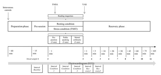 The participants completed the stress and resting conditions on separate days over a time frame of seven days. The start of both conditions was scheduled between 2:00 p.m. and 5:00 p.m., and the testing sequence of the two conditions (stress and resting) was randomized. The participants were asked to refrain from eating, drinking, and smoking for at least two hours before testing and during the 2 h testing session. The intravenous cannula was inserted 45 min before the first blood sample was taken to avoid a pain-induced cfDNA release. The experimental protocol started with a 15-min pre-session, in which a three-minute respiratory sinus arrhythmia test (six breaths per minute) was performed, and two blood samples were collected. Afterwards, the healthy male adults went through the two 15-min conditions (stress and resting). The Trier Social Stress Test (TSST) was performed according to the published process protocol by Kirschbaum et al. [], with three sections consisting of preparation, interview, and a calculation task (5 min per block). During the resting condition, the participants were given the opportunity to read magazines. The cognitive appraisal was evaluated three minutes after the start of either condition by the Primary Appraisal Secondary Appraisal (PASA; []). Immediately after both conditions, the self-reported stress perception of both conditions was measured with the visual analogue scale (VAS). After the stress and resting conditions, the participants were reposed in the supine position on a surgery bed for 105 min while nine blood samples (+1, +5, +10, +20, +30, +45, +60, +75, and +105 min) were collected. The participants were fitted with a chest trap to measure the heart rate during the whole experimental protocol with the Polar monitoring system V800 with the H10 sensor (Polar, Finland). An overview of the examination procedure is given in Figure 2.