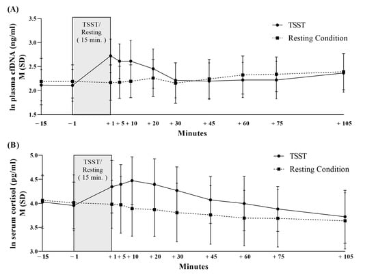 The following supporting information can be downloaded at: https://www.mdpi.com/article/10.3390/cells12040564/s1, Figure S1: Spaghetti plot of cell free DNA concentration (A,B) and cortisolconcentration (C,D) during Trier Social Stress Test and resting condition.