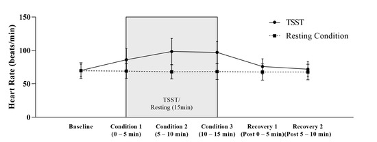 Second, the success of the stress induction was evaluated by the heart rate reactivity. To reflect the effect of the stress condition on the heart rate, ANOVA for repeated measurements with within-factor condition (stress vs. resting) and time was analyzed. The delta between peak and baseline was calculated and the difference between the stress and the resting conditions was tested by the dependent t-test.