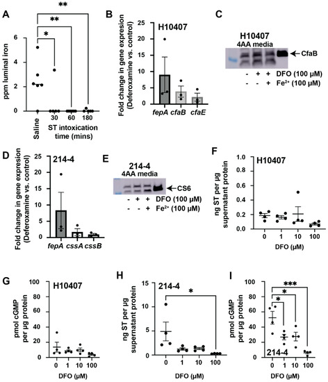 ST-induced depletion of luminal iron alters ST activity in ETEC H10407 and 214-4. ST intoxication causes a sustained decrease and flux in luminal iron (Fe) that begins during peak secretion (30 min of intoxication) and extends beyond 180 min (A). Iron limitation via deferoxamine mesylate (100 µM) increases expression of fepA, cfaB, and cfaE in ETEC H10407 (B). ETEC H10407 expresses more CFA/I when cultured with deferoxamine mesylate (100 µM) in 4AA media (C). Iron limitation via deferoxamine mesylate (100 µM) increases expression of fepA but not cssA and cssB in ETEC 214-4 (D). ETEC 214-4 expresses more CS6 when cultured with exogenous ferrous ammonium sulfate (100 µM) in 4AA media (E). ST production and secretion in ETEC H10407 cultured in 4AA media are unchanged in the absence and presence of increasing amounts of deferoxamine mesylate (1.0, 10, 100 µM) (F). No significant differences were observed when supernatants from ETEC H10407 cultured in 4AA media in the absence and presence of increasing amounts of deferoxamine mesylate (1.0, 10, 100 µM) were applied to T84 cells for ST-mediated induction of cGMP (G). ST production and secretion in ETEC 214-4 are suppressed when cultured in 4AA media containing deferoxamine mesylate (100 µM) (H). ST activity from ETEC 214-4 is significantly reduced when cultured in 4AA media containing deferoxamine mesylate (1.0, 10, 100 µM) (I). Data were analyzed via one-way ANOVA with matched conditions. *, p < 0.05; **, p < 0.01; ***, p < 0.001.