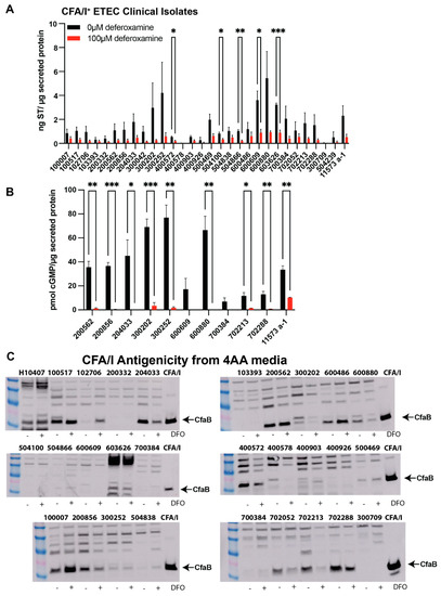 We next screened a library of CFA/I+ clinical isolates obtained from cases of moderate-to-severe diarrhea from the GEMS study [6,14] for the impact of deferoxamine (100 µM) on CF expression and ST production/activity. ETEC isolates were cultured overnight in chemically defined 4AA media, which enhances ST production, and cell-free supernatants were screened for ST production and ST activity. Lysates were screened for CF expression. It is important to mention that the overnight culture OD for the isolates grown in the presence and absence of deferoxamine were similar. As shown for CFA/I+ ST-ETEC isolates, the inclusion of deferoxamine (100 µM) reduced ST production (Figure 3A) per total protein in all strains tested. In some strains, deferoxamine increased secreted protein levels. Next, we down-selected ETEC isolates based on an antigenicity threshold of 1.7–2 ng ST/µg total secreted protein to screen for ST toxicity. In short, 10 µg of cell-free supernatant from ETEC isolates grown in the absence and presence of deferoxamine were applied to confluent T84 cells for ST-mediated induction of cGMP. As shown, deferoxamine reduced ST activity per µg secreted protein in all ETEC isolates, although there was still measurable activity in ETEC strains 200562, 300202, 300252, 702052, 702213, and 11573 a-1 following deferoxamine treatment (Figure 3B); although the ST competitive ELISA identified ST in supernatants of ETC isolate 603626, application of these supernatants to T84 cells failed to induce cGMP. Next, we assessed CFA/I expression in ETEC lysates grown in the presence and absence of deferoxamine via Western blotting. As shown, CFA/I expression is not uniform across ETEC isolates (Figure 3C), consistent with different isolates having varying abilities to hemagglutinate red blood cells [24]. Similar to ETEC H10407, deferoxamine treatment increases CFA/I expression in some isolates (100007, 102706, 600486), but deferoxamine treatment also decreases CFA/I expression in other isolates (200856, 204033, 400572, 702052). Uncropped Western blots are available in the Supplementary Data. Together, these data reinforce the notion that CFA/I+ ETEC are heterogenous in their response to deferoxamine.