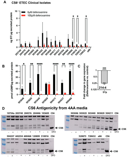 We next screened a library of CS6+ ST-ETEC clinical isolates obtained from cases of moderate-to-severe diarrhea from the GEMS study [6,14] for the impact of deferoxamine (100 µM) on CF expression and ST production/activity. Deferoxamine also decreases ST production per µg secreted protein in CS6+ ST-ETEC clinical isolates (Figure 4A). Furthermore, the ability to induce cGMP is broadly suppressed in many of the CS6+ ST-ETEC clinical isolates (Figure 4B). Interestingly, deferoxamine decreased ST production in ETEC isolate 503829 as measured via the ST competitive ELISA, and 503829 supernatants induced similar amounts of cGMP when applied to T84 cells. This could be explained by the fact that other antigenic ST isoforms exist and suggest that deferoxamine promotes the formation of the isoform that engages with the guanylyl cyclase C receptor to increase cGMP production. In support of the broad effects of deferoxamine on ST expression in diverse isolates, we demonstrate via qPCR that the gene encoding STp in ETEC 214-4 is significantly downregulated 4-fold following deferoxamine treatment (Figure 4C). Lysates from CS6+ ST-ETEC clinical isolates were then screened for CS6 antigenicity via Western blots (Figure 4D). Overall, we did not notice major impacts following the inclusion of deferoxamine, except we found that deferoxamine suppresses CS6 expression in ETEC isolates 503829, 504211, and 120899. Overall, these data demonstrated that deferoxamine suppresses ST production and activity, but no generalities could be made for changes in CFA/I or CS6 expression.
