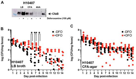 Although mice are not natural ETEC hosts, murine models can be used as a proxy to understand ETEC colonization and shedding in a mammalian host [16]. Here, we tested the impact of deferoxamine on ETEC H10407 shedding in a streptomycin mouse model [16]. Female CD1 mice (7–10 weeks old) were orally gavaged with deferoxamine (600 µg) 24 h before and immediately prior to ETEC inoculation. In this model, we show streptomycin causes a significant drop in fecal iron in all mice (Figure S1), but fecal iron levels in deferoxamine-treated mice and control mice were similar (data not shown). When ETEC H10407 was cultured in LB broth, oral deferoxamine treatment significantly increased ETEC fecal shedding on days 5–8 of infection (Figure 5B). This is consistent with the deferoxamine-mediated induction of CFA/I in ETEC H10407 when cultured in LB (Figure 5A). On the other hand, when ETEC H10407 was cultured on CFA agar, ETEC shedding rates were similar between mice treated with oral deferoxamine and control mice (Figure 5C). This supports CFA/I-mediated attachment to the intestinal epithelium since deferoxamine did not affect CFA/I production when grown on CFA agar, although the impact of iron restriction and deferoxamine on innate immune responses cannot be ruled out [38].