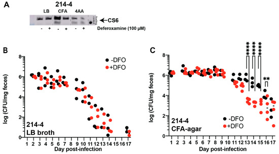 Previous studies have shown that CS6 production is upregulated by iron and suppressed by iron restriction via deferoxamine [21]. Thus, we next assessed the role of deferoxamine on ETEC 214-4 colonization in the streptomycin mouse model. First, we cultured ETEC 214-4 in LB, CFA, and 4AA media and then supplemented each culture condition with exogenously added deferoxamine (100 µM). In contrast to the deferoxamine-mediated induction of CFA/I production shown for ETEC H10407, we demonstrate that deferoxamine suppresses CS6 production approximately 25-fold when cultured in CFA medium (Figure 6A). In contrast, when ETEC 214-4 was cultured in LB or 4AA, the addition of deferoxamine (100 µM) did not impact CS6 production, as compared to base media alone (Figure 6A). To demonstrate that ETEC growth conditions affect its ability to adhere to the intestinal epithelium and influence fecal shedding, we then cultured ETEC 214-4 in LB and CFA medium for in vivo assays. Mice were either left untreated or pre-treated with oral deferoxamine before ETEC 214-4 inoculation. As would be expected, oral deferoxamine pre-treatment did not affect ETEC 214-4 fecal shedding when it was cultured in LB (Figure 6B). We believe this to be because there were no changes to CS6 production between these culture conditions (Figure 6A). In contrast, when ETEC 214-4 was cultured on CFA agar, oral deferoxamine pre-treatment caused quicker clearance of the infection, with significant differences noted between groups on days 13-16 (Figure 6C). Again, this supports the in vitro data suggesting that deferoxamine suppresses CS6 production when grown in CFA (Figure 6A).