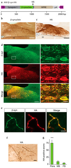 To overcome the technical issue described above, new AAVs were generated that encoded α-syn with an HA tag at its C-terminal end (AAV-β-syn-HA) (Figure 2a). Mice received a single injection of this AAV-β-syn-HA into the left vagus nerve, and 6 weeks later, their brains were processed for histological assessment. For the first set of analyses, coronal tissue sections of the medulla oblongata were immunostained using antibodies raised to detect β-syn or HA. Microscopic images of β-syn immunoreactivity were similar in samples from mice injected with AAV-β-syn-HA as compared to animals treated with AAV-β-syn (cf. Figure 1f and Figure 2b); they showed increased labeling of dMO neurons on a relatively high background staining (Figure 2b). This background staining was abolished when specimens from AAV-β-syn-HA-injected mice were labeled with anti-HA, allowing a clear, unambiguous detection of transgenic human β-syn within vagus-associated dMO neurons (Figure 2c). Next, medullary sections from AAV-β-syn-HA-injected mice were double-labeled with anti-β-syn and anti-HA and processed for immunofluorescence. Results showed consistent co-localization, thus confirming a precise detection of β-syn using the HA antibody (Figure 2d). In particular, double-labeled neuronal cell bodies were evident in the DMnX, indicating neuronal transduction and overexpression (Figure 2d, higher magnification). Anti-β-syn and anti-HA were also used to double-label pontine sections and assess this tissue for the presence of extra-medullary human β-syn. Distinct, co-labeled axons were detected as a result of this analysis, pointing to a caudo-rostral (medullary-to-pontine) spreading of the “entire” (human β-syn plus HA) exogenous protein (Figure 2e).