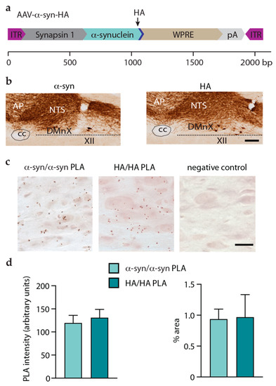 To detect and compare aggregate formation after AAV-induced overexpression of HA-tagged proteins, a new PLA was developed; the assay was designed to recognize HA molecules in close proximity as markers of protein assembly. An important initial step in the development and validation of this HA/HA PLA was to carry out an experiment in mice that were injected intravagally with AAV vectors encoding for HA-tagged human α-syn (AAV-α-syn-HA) (Figure 4a). Since overexpression-induced aggregation of human α-syn has already been demonstrated using α-syn/α-syn PLA [24], the aim of these experiments was to analyze samples using either α-syn/α-syn or HA/HA PLAs and to determine if the two assays yielded comparable results. In mice injected with AAV-α-syn-HA and sacrificed 6 weeks later, robust protein overexpression was seen in the dMO after staining with an antibody raised against human α-syn; a similar pattern and intensity of immunostaining were observed in tissue sections labeled anti-HA (Figure 4b). Medullary sections from AAV-α-syn-HA-treated animals were then processed for α-syn/α-syn or HA/HA PLA. Results using the two complementary (negative and positive) α-syn/α-syn or HA/HA PLA probes showed clear labeling in vagus-associated medullary neurons, including cells in the DMnX (Figure 4c). The specificity of this labeling was confirmed by its absence in control samples that were processed without the negative PLA probe (Figure 4c). Further semi-quantitative assessment of PLA reactions was carried out by measuring PLA signal intensity and by calculating the dMO area occupied by the PLA signal. Comparative analyses indicated that similar signal intensities and similar areas of signal distribution characterized samples that were processed either with α-syn/α-syn or HA/HA PLA (Figure 4d). Data therefore demonstrated the suitability and effectiveness of HA/HA PLA as a technique capable of detecting the aggregation of HA-tagged proteins.