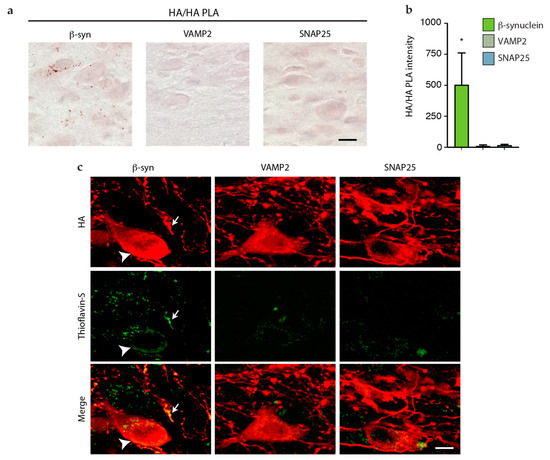 HA/HA PLA was then used to investigate protein assembly in mice injected with AAV-β-syn-HA, AAV-VAMP2-HA, or AAV-SNAP25-HA. Analyses indicated clear differences between the first vs. the other two groups of animals. Specific PLA signals were indeed detected in animals overexpressing β-syn-HA, whereas medullary sections from mice overexpressing VAMP2- or SNAP25-HA were consistently devoid of labeling (Figure 5a,b). Further evidence of β-syn-HA aggregation was obtained from the analysis of medullary sections from AAV-β-syn-HA-injected mice stained with Thioflavin-S, a fluorescent dye that binds to amyloid structures. As shown in Figure 5c, Thioflavin-S labeling was detected within DMnX cell bodies and neurites that overexpressed β-syn-HA and were therefore co-stained with anti-HA. Consistent with the results of HA/HA PLA analyses, medullary sections from mice treated with AAV-VAMP2-HA or AAV-SNAP25-HA were devoid of Thioflavin/HA co-localization (Figure 5c). These data revealed the ability of β-syn, but not VAMP2 or SNAP25, to form aggregate species after its overexpression within vagus-associated neurons in the dMO. Together with the results on overexpression-induced protein spreading, these findings also support a relationship between the formation of protein aggregates and interneuronal β-syn transfer.