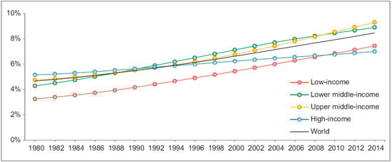 Trends in prevalence of DM from 1980 to 2014 by country income group. DM, diabetes mellitus [2] (permission number 391487).