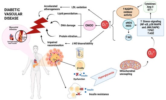 Previous studies demonstrated an important role of oxidative stress in the pathogenesis of CVD in patients with DM and that hyperglycemia is the origin of elevated oxidative stress [63,64,65,66,67]. In addition, oxidative stress affects β-cells through different mechanisms Figure 7 [68,69]. A healthy and functional mass of pancreatic β-cells is necessary for normal glucose homeostasis, and varying levels of β-cell dysfunction accompany DM. For instance, oxidative stress can initiate apoptotic processes in the pancreatic cells, consequently causing the loss of β-cells [68,69]. Likewise, enhanced free radical species production negatively affects metabolic pathways in the β-cells and impairs KATP channels leading to lower insulin secretion.