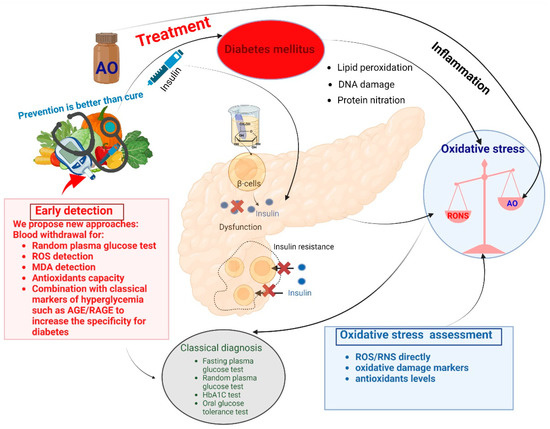 A significant cause of DM is oxidative stress. Under normal physiological conditions, the production of ROS and harmful RNS is low, and the antioxidant system quickly removes both before they induce any structural and functional damage. However, this balance is fragile; accordingly, ROS- and RNS-induced cellular damage appears frequently, and the damaged molecules must be repaired or replaced, as described in vivo in animals and humans [18].