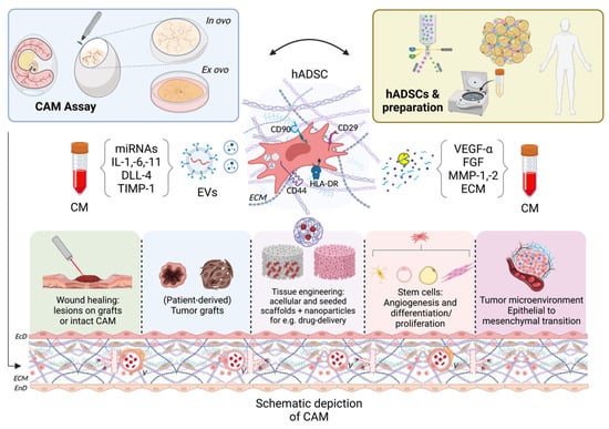 Schematic illustration of existing and potential applications of the chorioallantoic membrane (CAM) assay in ADSC research. Cells can be either isolated from human donors or obtained commercially. After a certain pre-treatment they can be grafted onto the available in ovo or ex ovo CAM models in order to investigate wound healing, tumor (anti-)angiogenesis and its microenvironment, (bio-)scaffolds, and stem cell proliferation and/or differentiation. Therefore, a human adipose-tissue-derived stem cell (hADSC) exemplarily positive for cluster of differentiation 29 (CD29), CD44, CD90, and Human Leukocyte Antigen DR isotype (HLA-DR) is depicted with its secretome, i.e., extracellular vesicles (EVs) and paracrine products, e.g., extracellular-matrix (ECM) and matrix metalloproteases (MMPs), which can be isolated and added onto the CAM as a conditioned medium (CM). The CAM structure is depicted with its outer and inner sheeting consisting of ectodermal (EcD) and endodermal epithelium (EnD), respectively. Between those two layers rich extracellular matrix (ECM) with partially spouting vessels (V) is shown. Additional abbreviations: miRNAs—micro ribonucleic acids, IL—interleukin, DLL—Delta-like protein, TIMP—tissue inhibitor of metalloproteinases, VEGF—vascular endothelial growth factor, FGF—fibroblast growth factor. Created with BioRender.com ®(accessed 7 February 2023).