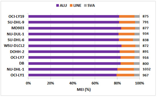 Fraction of three classes of mobile element insertions (MEIs), viz., ALU, LINEs, and SVA. Total number of MEIs per cell line is indicated on the right panel.