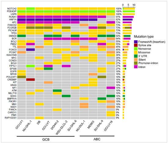 Oncogenes and tumor suppressor genes containing ‘high’ and ‘medium’ priority mutations were extracted (Table S3), and those present in one or more cell lines are shown in Figure 3. Recurrent mutations were observed in genes TP53, FCGR2B, BCL6, BCL2, MYC, and EGFR, which were implicated in DLBCL in earlier studies [30]. Mutations in genes BCL2 (6/11 cell lines), MYC (4/11), BCL6 (3/11), POU1AF1 (2/11), and PIM1 (1/11) are known to be potential targets of aberrant somatic hypermutation (aSHM) [7]. Of these, mutations in PIM1 and POU1AF1 were observed to be specific to ABC cell lines, while mutations in BCL2, MYC, and BCL6 were present in both the subtypes. Some genic SSVs, although observed in only a few cell lines, may play an important role in DLBCL lymphomagenesis. For example, mutations in CREBBP were observed in only two GCB cell lines, NU-DHL-1 and WSU-DLCL2. Gene CREBBP encodes for transcriptional activator CREB-binding protein and is involved in histone acetylation. Studies on an in vivo mice model with mutations in CREBBP were shown to exhibit decreased histone H3 acetylation, reduced MHC II expression, and increased cell proliferation compared to the wild type [31]. Similarly, mutations in genes CARD11 and PIM1 were observed in only one ABC cell line, MD903. Interestingly, from the data in cBioPortal, mutations in CARD11 and PIM1 tended to co-occur in 29/1295 DLBCL patients with high significance (Fisher’s exact test, p-value: 0.03).