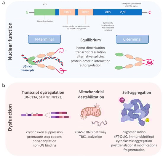 The schematic shows (a) the structure of TDP-43 and its importance for the physiological functions within the cell nucleus, and (b) the dysfunctional state of TDP-43 with the dysregulation of its nuclear function, destabilization of mitochondria, and its aggregation propensity.