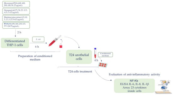 The specific anti-inflammatory activity on the bladder urothelium of the three functional ingredients and of the mixture was evaluated on an in vitro bladder urothelium composed of the T24 cell line (ATCC HTB-4TM). T24 cells were exposed for 4 h to conditioned media obtained by treating macrophage-differentiated THP-1 cells with different concentrations of the functional ingredients and mixture in the presence of E. coli. At the end of the treatment, T24 cells were detached with trypsin, centrifuged, and lysed by sonication in lysis buffer. The supernatant obtained following centrifugation for 10.000 runs for 10 min at 4 °C was stored at −80 °C. An extensive analysis of the impact of the functional ingredients and mixture on inflammation was conducted by assay for the determination of transcription factor NF-kB (Abcam) and the evaluation of pro-inflammatory cytokine expression with an array of 23 human cytokines (Raybiotech, Peachtree Corners, GA, USA), following the manufacturer’s instructions. The cytokines interleukin 1β (IL-1β), interleukin 6 (IL-6), and interleukin 8 (IL-8) were quantified by ELISA assay. The flow chart shown in Figure 1 illustrates the experimental approach previously described.