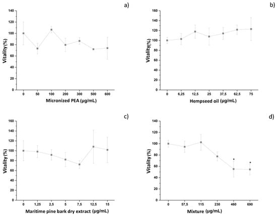 Vitality of differentiated THP-1 cells after treatment with different concentrations of (a) micronized PEA, (b) hempseed oil, (c) maritime pine bark dry extract, and (d) mixture. * vitality < 70%.