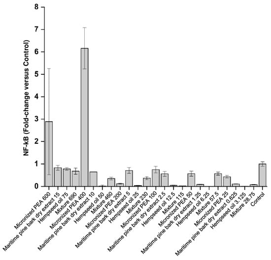 In the present study, we demonstrated that the mixture composed of micronized PEA, hempseed oil, and maritime pine bark dry extract had a synergistic anti-inflammatory effect at different concentrations, with greater effectiveness than that of its individual components. Specifically, the mixture reduces (i) the nuclear content of the transcription factor NF-kB at the concentrations of 115 μg/mL and 690 μg/mL; (ii) the expression of the pro-inflammatory cytokine GRO-alpha in the concentration range 115 to 690 μg/mL; (iii) the expression of the pro-inflammatory cytokine GRO a/b/g at concentrations of 57.5 μg/mL, 230 μg/mL, and 460 μg/mL; (iv) the expression level of the cytokine GM-CSF at the concentrations of 230 μg/mL and 460 μg/mL; (v) IL-1β expression in the concentration range 115 to 690 μg/mL; (vi) IL-6 expression in the concentration range 115 to 230 μg/mL; and (vii) IL-8 expression in the concentration range 230 to 690 μg/mL.