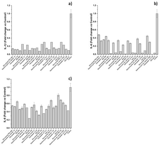 Expression of (a) IL-1β, (b) IL-6, and (c) IL-8, reported as fold changes compared to control (cells treated with medium conditioned only with the inflammatory stimulus, E. coli) after treatment of bladder urothelium cells with the three functional ingredients and their mixture at different concentrations.